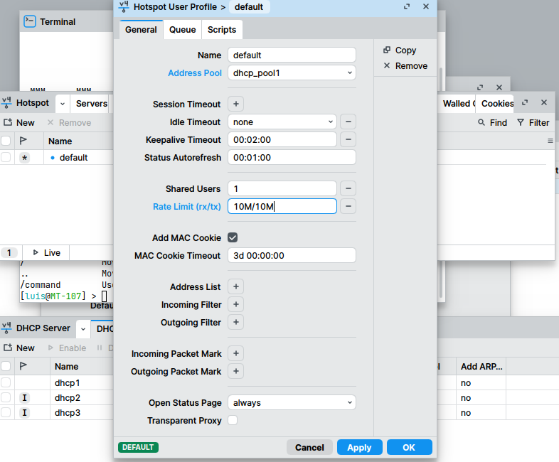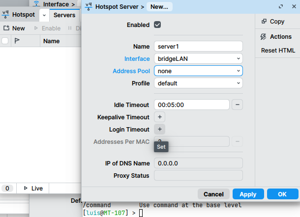 - Crear un servidor dhcp al bridge con el pool creado. Se recomienda dejar algunas IPs para equipos estáticos (servidores, impresoras, etc).